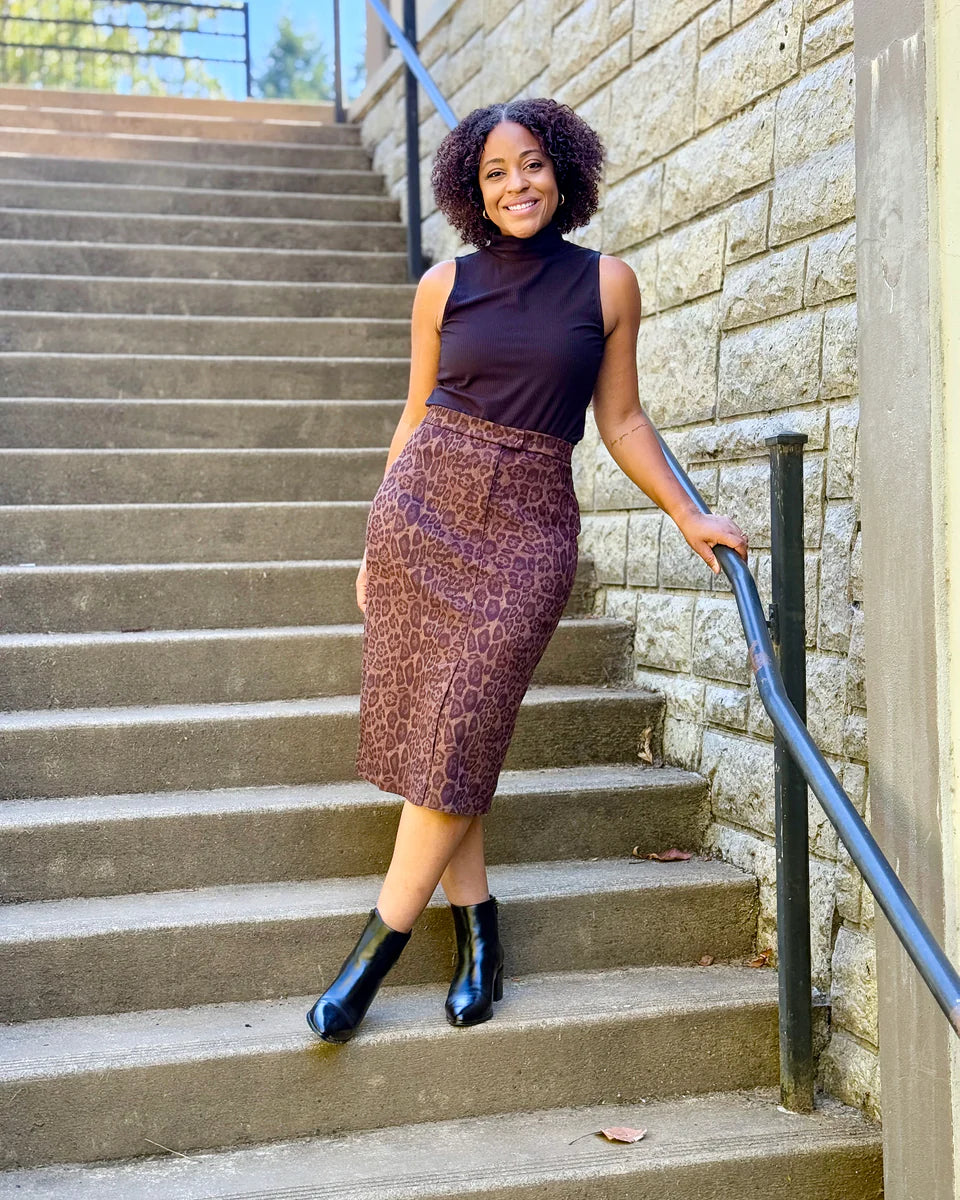 This THML Cheetah Suede Skirt features a straight cut with a front slit, front zipper with a fabric-covered snap, and a hidden button fly. It includes subtle horizontal seam detailing at the center, creating a flattering fit that enhances your curves. The soft suede texture offers a comfortable, lightweight feel. Easily style this timeless skirt with a black top for a polished look.