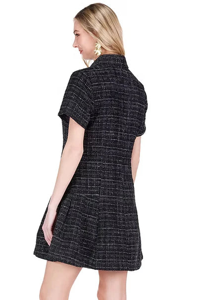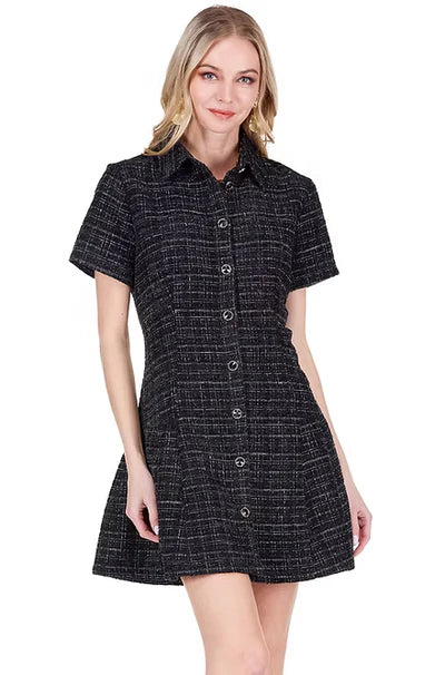 Classic, chic, and effortlessly flattering- the Joy Joy Pleated Hem dress in black is a versatile staple you'll reach for time and time again. Designed with a tailored fit through the waist and a subtle pleated hem, this dress strikes the perfect balance between structure and feminine charm. The button-front closure and collared neckline add a polished touch, while the short sleeves keep it fresh and easy to wear year-round.