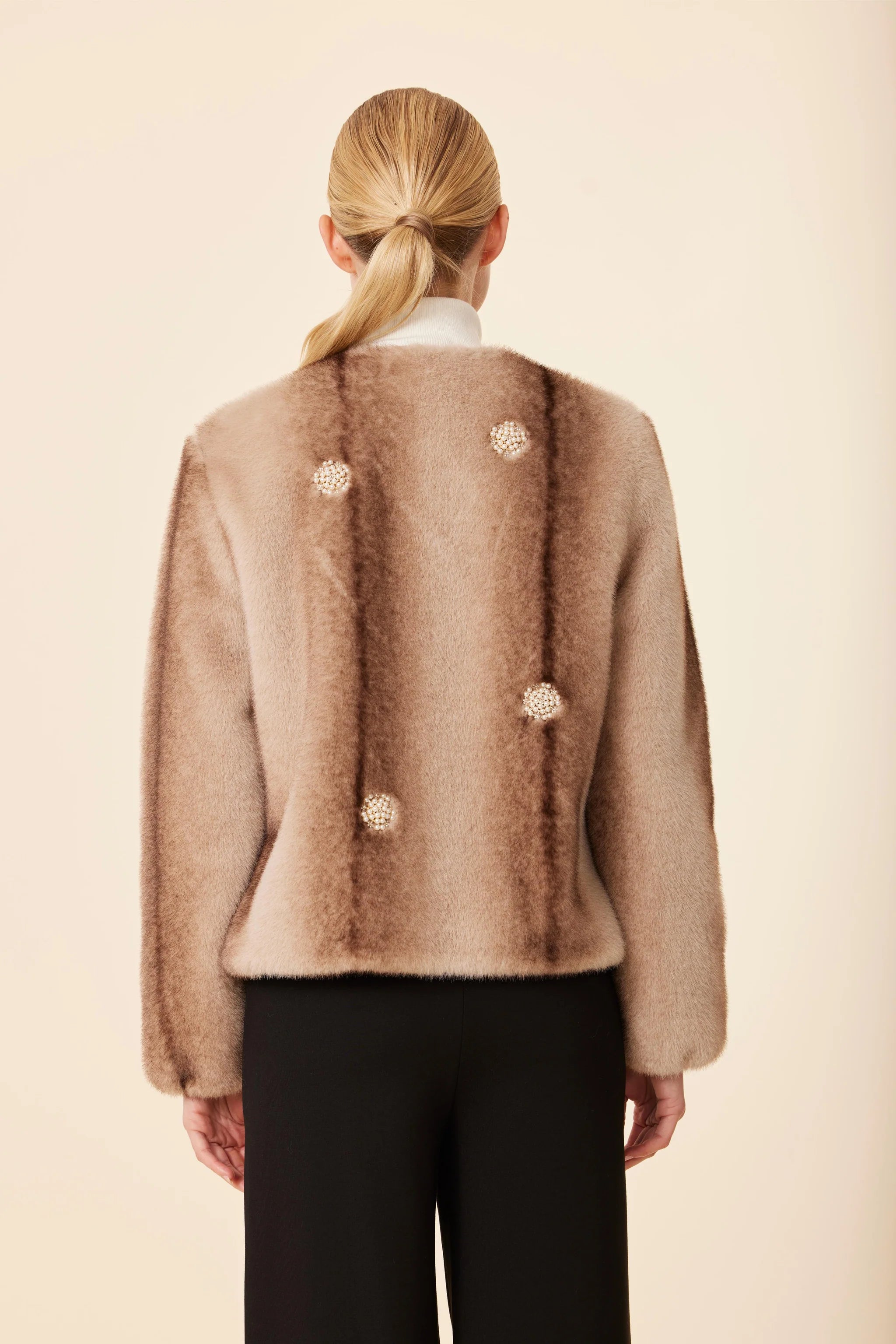 Wrap yourself in luxury this Fall with our mocha faux mink jacket, adorned with pearl-embellished accents for a touch of glamour. Featuring a soft, plush texture and elegant design, this cruelty-free outerwear piece offers both warmth and sophistication—perfect for chic autumn layering and statement cold-weather style.