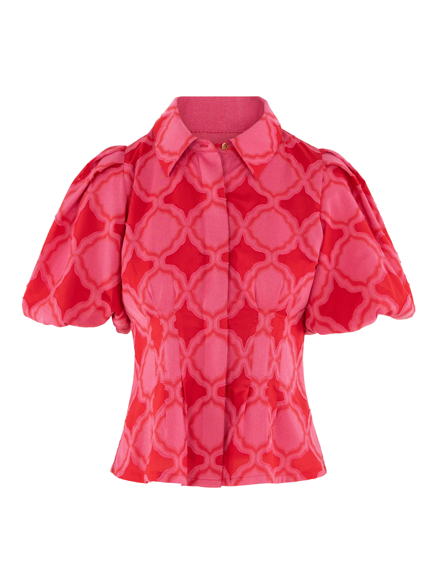 The Britt Top in Villa blends tailored structure with romantic volume, featuring a classic fold collar, softly puffed sleeves, and a lightly boned bodice that creates a flattering, sculpted shape. A subtle peplum hem adds gentle movement while maintaining a clean, structured look. Fabricated in the Villa jacquard print—a textured, feminine pattern inspired by the mosaic tilework of Jaipur—this top feels tasteful yet expressive, offering a statement silhouette designed for elevated everyday moments and beyond.