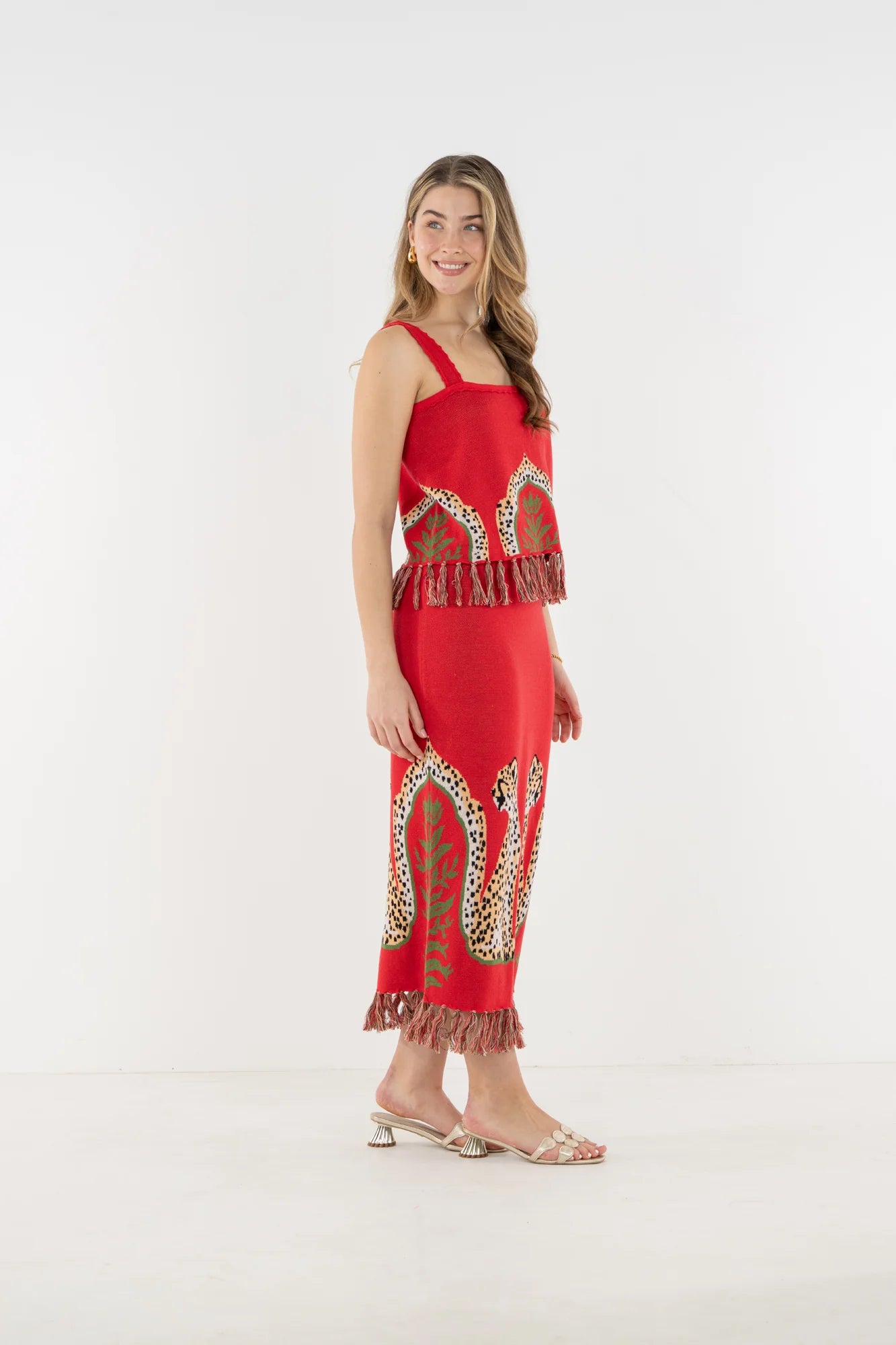 The Capri Knit Tank in Cheetah Rouge is an easy statement with a comfortable silhouette and playful fringe detailing along the hem. The Cheetah Rouge motif showcases majestic cheetahs framing lush green florals in a striking, symmetrical composition. Softly casual yet expressive, it’s designed to pair perfectly with the coordinating Capri Knit Skirt for breezy beach days, coastal getaways, or relaxed weekend brunching.