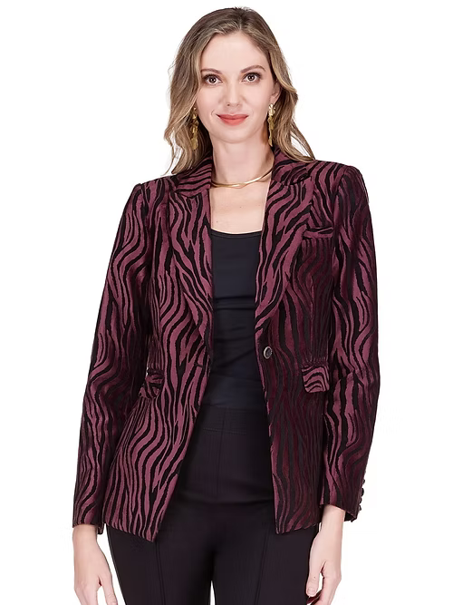 Make a bold and sophisticated statement with the Jade classic button jacket in rose wild. Featuring a rich rose and black zebra-inspired pattern, this tailored blazer blends classic structure with modern edge. The single-button closure and sleek silhouette create a flattering, polished look-perfect for pairing with black pants or denim for an effortlessly chic ensemble.