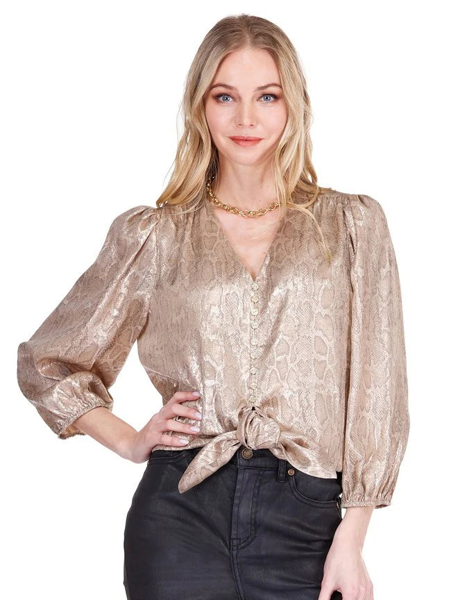 Elevate your look with the Joy Joy front tie blouse in gold python. Featuring a subtle metallic sheen and a chic snakeskin-inspired pattern, this blouse brings a touch of glamour to any outfit. The flattering V-neckline, puff sleeves, and tie-front detail create a polished yet playful silhouette-perfect for pairing with sleek trousers or dark denim for an effortlessly sophisticated look.