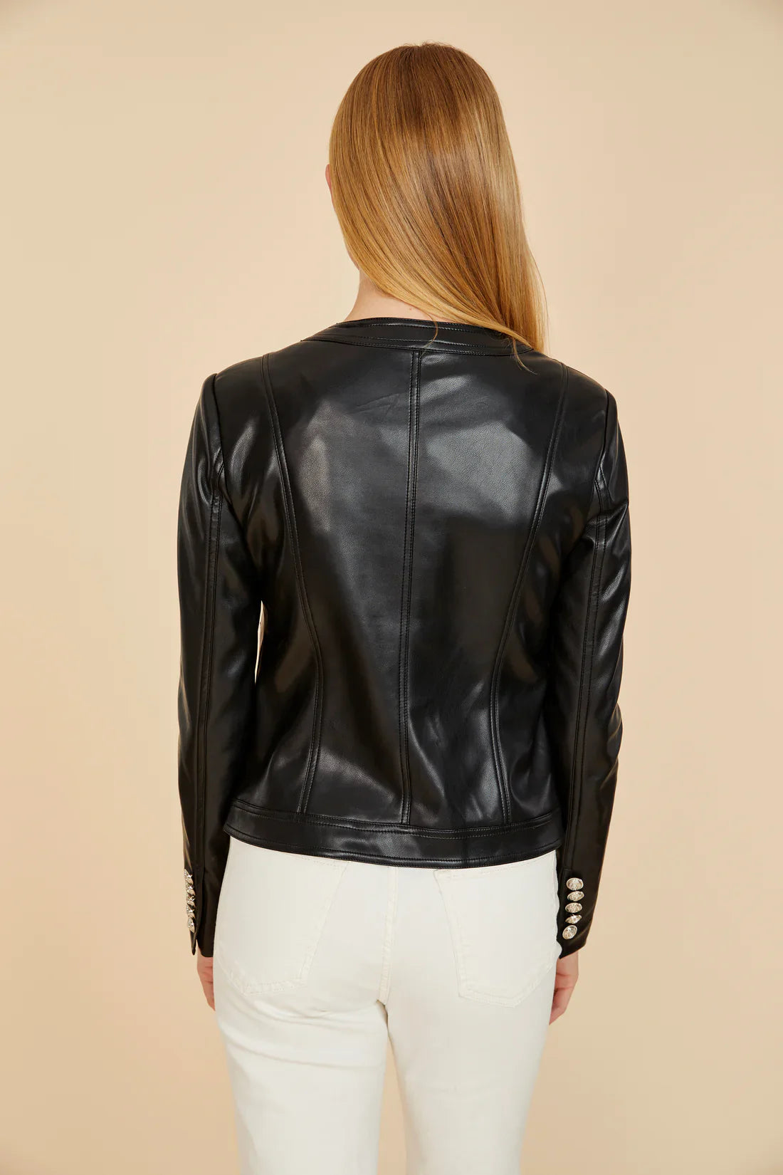 Embrace an edgy vibe with our Faux Leather Jacket. This fitted jacket exudes contemporary coolness, featuring multiple front pockets and metallic buttons for both style and functionality. Crafted from faux leather, it seamlessly blends a bold aesthetic with versatile wear. Elevate your outerwear collection with this statement piece that adds a touch of attitude and glam to your everyday look.