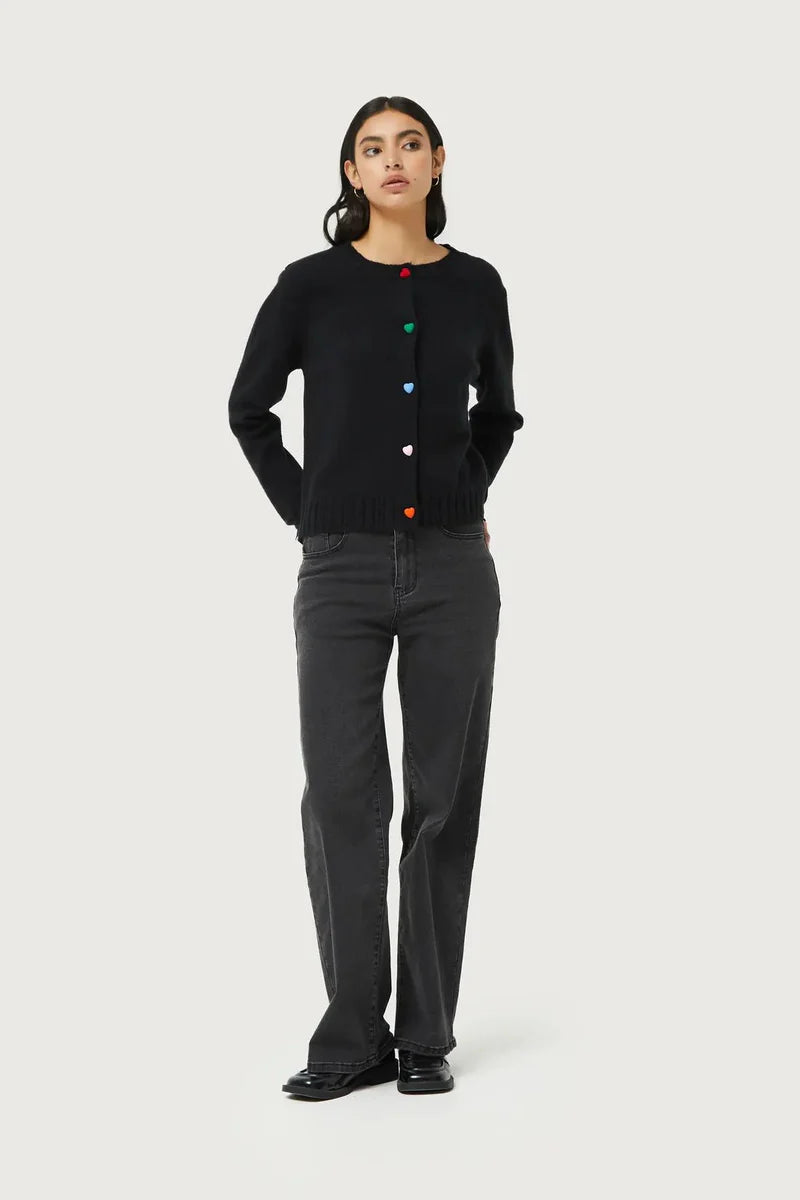 This stylish black cardigan features multi colored heart buttons and a classic crewneck design. The unique heart buttons add a touch of whimsy and charm, while the classic black color allows for versatility and easy pairing with any outfit. Stay cozy and fashionable with this heart button cardigan.