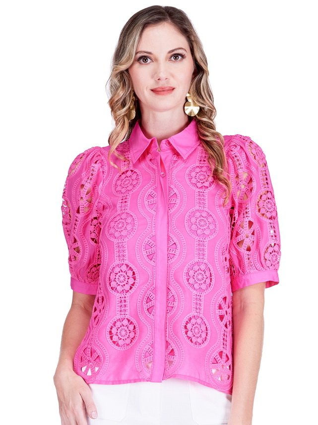 Elegant and timeless, the Jade Pink Lace Blouse brings a romantic touch to your wardrobe. Crafted in a delicate pink hue, this blouse features intricate lace detailing that adds texture and sophistication. The flattering silhouette makes it perfect for dressing up for special occasions or elevating your everyday style. Pair it with tailored bottoms or denim for a look that’s both graceful and effortless.