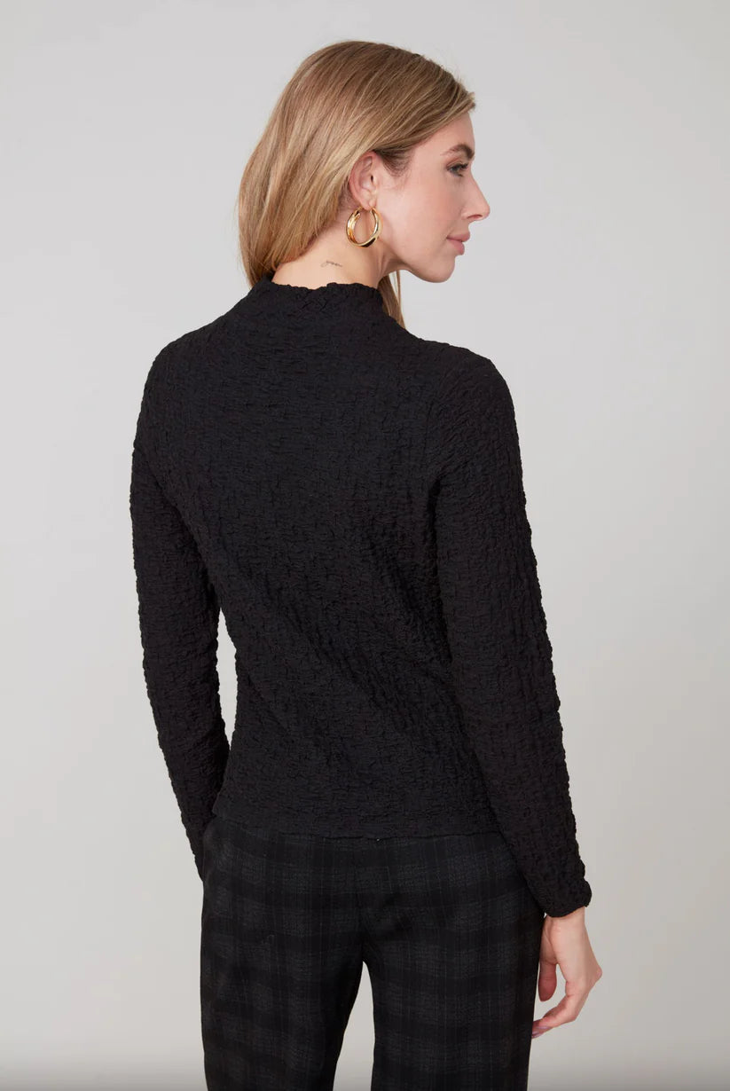 Effortlessly chic and endlessly versatile, this Renuar knit top in the shade Oyster, and Black, is a wardrobe essential. Crafted from a lightweight, stretch knit fabric, it offers a flattering fit that moves with you. The subtle textured finish and delicate mock neck detail adds a refined touch, making it perfect for both layering and standalone wear. Long sleeve and a softly fitted silhouette create an elegant balance of comfort and style.