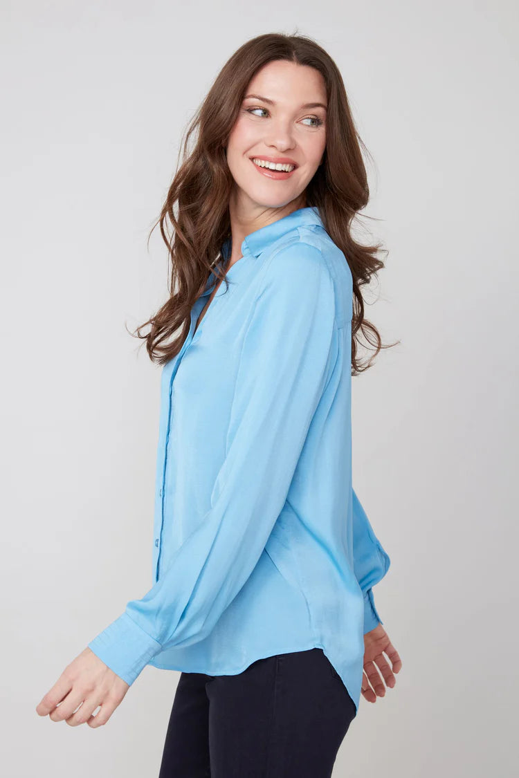 Effortlessly polished and endlessly versatile, the Renuar Woven Blouse in Delphinium brings timeless elegance to your everyday wardrobe. Crafted from a lightweight, breathable fabric with a soft, fluid drape, this blouse features a relaxed silhouette that flatters all body types. The ocean blue hue offers a sophisticated, yet fun, take on classic minimalism—perfect for pairing with everything from tailored trousers to your favorite denim. Thoughtful details like a gently rounded hem, subtle pleating, and a flattering V-neckline elevate this piece from simple to standout. Whether you're heading to the office or out for dinner, this blouse moves with you in style and comfort.